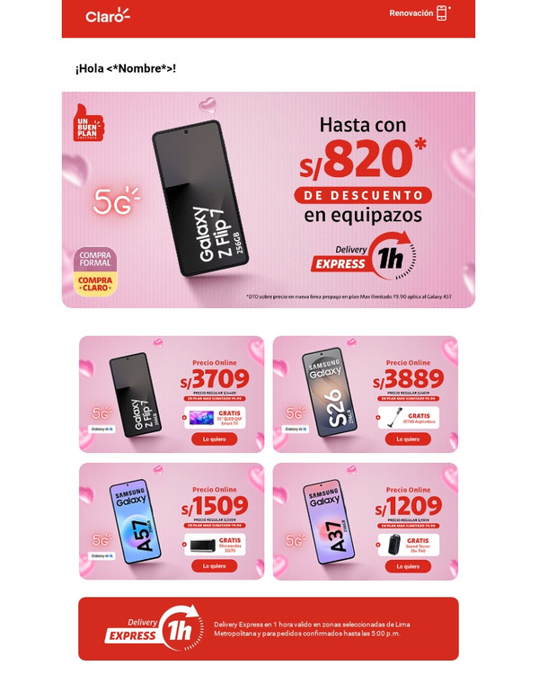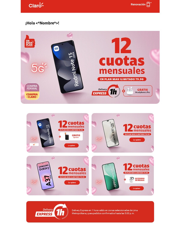 No vale en Cadenas de Tiendas. Sujeto a evaluación crediticia, para clientes DNI o RUC10, hasta el 15.04.26 y/o agotar stock. Stock mín: 3. Acuerdo de equipos y cuotas a 12 meses. En Renovación con acuerdo de equipos concluido de 18 meses. Costo de equipo no incluye costo del plan. Plan Max Ilimitado no vale en Iquitos. Cobertura Delivery Express y más restricciones: tiendaclaro.pe