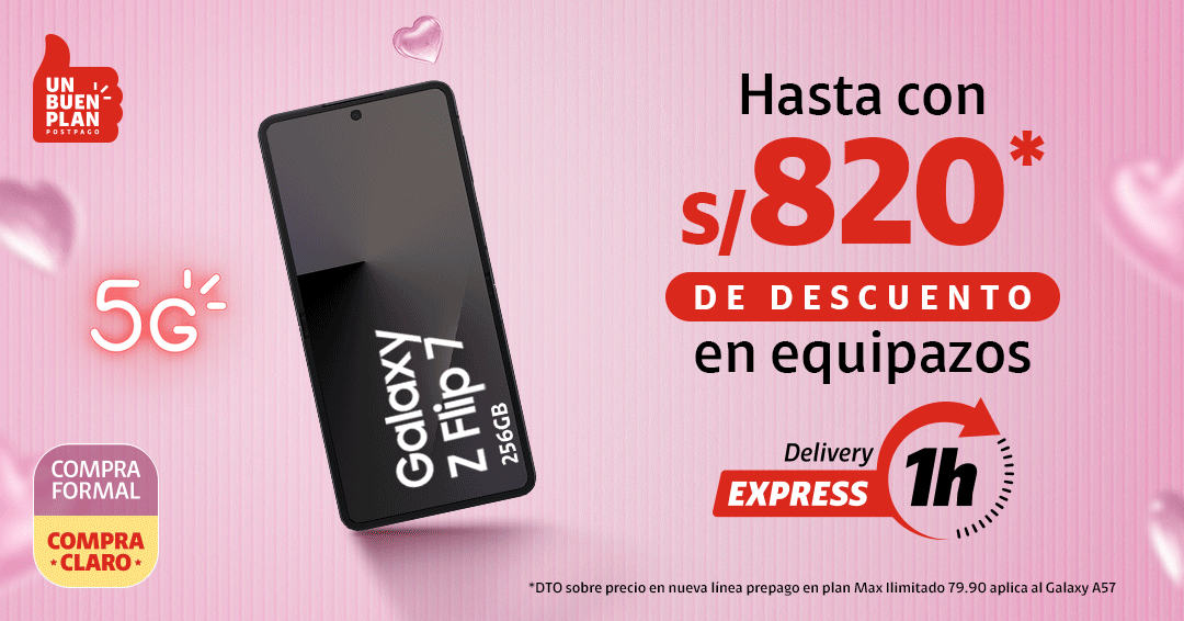 Sujeto a evaluación crediticia (clientes DNI y RUC 10). Vale al 30.04.26 y/o hasta agotar stock. Stock mín.: 3. Al contado con acuerdo de equipos a 18 meses. En renovación con acuerdo de equipos concluido. Costo de equipo no incluye costo del plan. Restricciones: tiendaclaro.pe