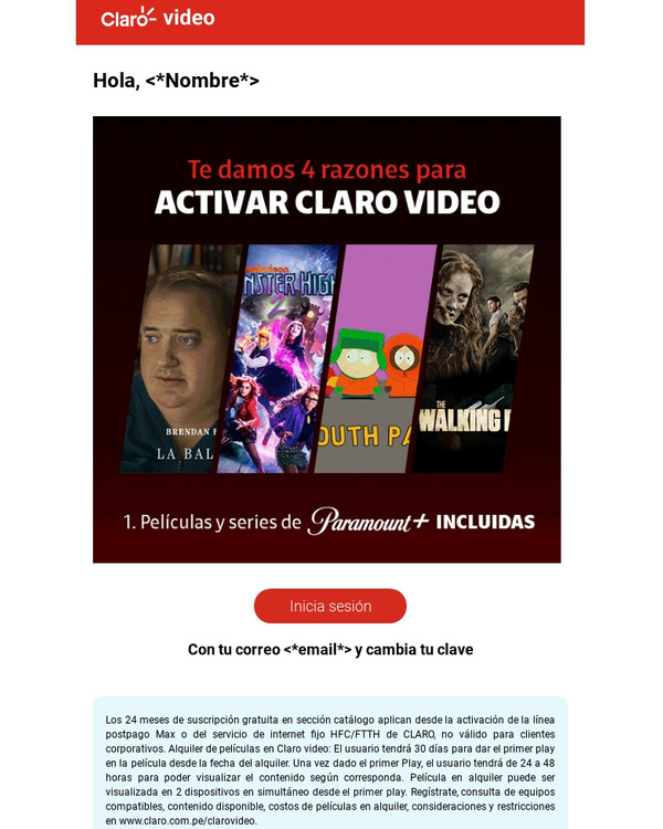 | | |  | | | | Con tu correo fenogreco@gmail.com y cambia tu clave | | | Los 24 meses de suscripción gratuita en sección catálogo aplican desde la activación de la línea postpago Max o del servicio de internet fijo HFC/FTTH de CLARO, no válido para clientes corporativos. Alquiler de películas en Claro video: El usuario tendrá 30 días para dar el primer play en la película desde la fecha del alquiler. Una vez dado el primer Play, el usuario tendrá de 24 a 48 horas para poder visualizar el contenido según corresponda. Película en alquiler puede ser visualizada en 2 dispositivos en simultáneo desde el primer play. Regístrate, consulta de equipos compatibles, contenido disponible, costos de películas en alquiler, consideraciones y restricciones en www.claro.com.pe/clarovideo. | | | | ¡Que la música te acompañe! | | Múevete al ritmo de tus canciones favoritas donde quieras. | | |  | ¿Ya escuchaste lo último? Disfruta tus playlist en Claro música sin consumir tus gigas Más información | | | |  | | | Claro música | | Si eres Claro estás a un clic de escuchar tus canciones favoritas | | | | | | | | | |