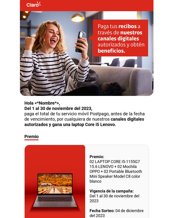 |  | Hola Gregorio Riofano Rosas, Del 1 al 30 de noviembre del 2023, paga el total de tu servicio m贸vil Postpago, antes de la fecha de vencimiento, por cualquiera de nuestros canales digitales autorizados y gana una laptop Core i5 Lenovo. | | | | |  | Premio: 02 LAPTOP CORE I5-1155G7 15.6 LENOVO + 02 Mochila OPPO + 02 Portable Bluetooth Mini Speaker Model C8 color blanco Vigencia de la campa帽a: Del 1 al 30 de noviembre del 2023 Fecha Sorteo: 04 de diciembre del 2023 | | | | | | | Promoci贸n v谩lida para mayores de 18 a帽os a nivel nacional con planes postpago m贸viles. Vigencia del 01/11/2023 al 30/11/2023. Stock de premios: 02 LAPTOP CORE I5-1155G7 15.6 LENOVO + 02 Mochila OPPO + 02 Portable Bluetooth Mini Speaker Model C8 color blanco. T茅rminos y condiciones en Sorteo Pago Digital I Claro Per煤 | | | | | |  | ¡Eres parte del club! Descubre las promociones y experiencias que tenemos para ti. M谩s informaci贸n | | | |  | | | Claro club | | Descarga el app y disfruta tus beneficios todos los d铆as. | | | | | | | | | |