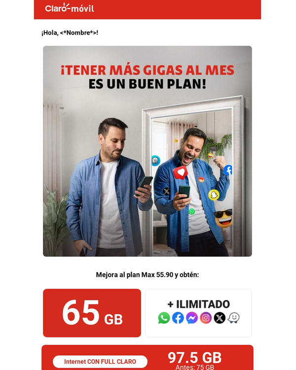 | | |  | | Mejora al plan Max 55.90 y obtén: | | | | | | | Déjanos tus datos y te llamaremos inmediatamente | | | | | | | Plan Max 55.90 viene con 65 GB al mes. Sujeta a evaluación crediticia (clientes DNI). Se garantiza 40% de velocidad contratada.Las apps expresamente indicadas valen por 12 meses, funcionalidades incluidas en las apps y más condiciones sobre el plan en: claro.pe/postpago. Conoce la cobertura en: cobertura.claro.com.pe | | | | Claro 5G ya es una realidad | | Vive la evolución de las redes desde tu móvil 5G. | | |  | FullClaro te da más Si tienes Claro en casa y en tu celular, recibes más beneficios sin pagar más Más información | | |  | | Mi Claro App | | Revisa el detalle de tu plan, descarga y paga tus recibos y afÃliate al debito automático. | | | | | | | | La descarga de la app requiere uso de datos del plan o conexión wifi. Disponible para Android 6.0 en adelante y para iOS 11.0 en adelante. Condiciones y restricciones de la app en www.claro.com.pe/app/mi-claro/. | | | | | |