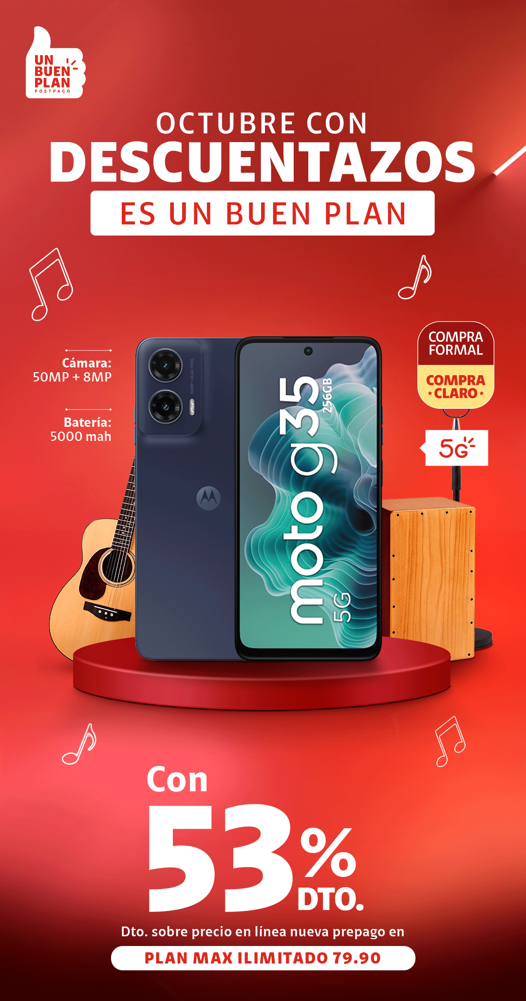 Sujeto a evaluación crediticia (clientes DNI y RUC 10). Vale al 31/10/25 y/o agotar stock. Stock mín.: 3. Al contado con acuerdo de equipos a 18 meses. En renovación con acuerdo de equipos concluido. Costo de equipo no incluye costo del plan. Restricciones: tiendaclaro.pe