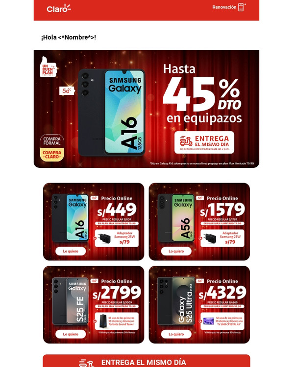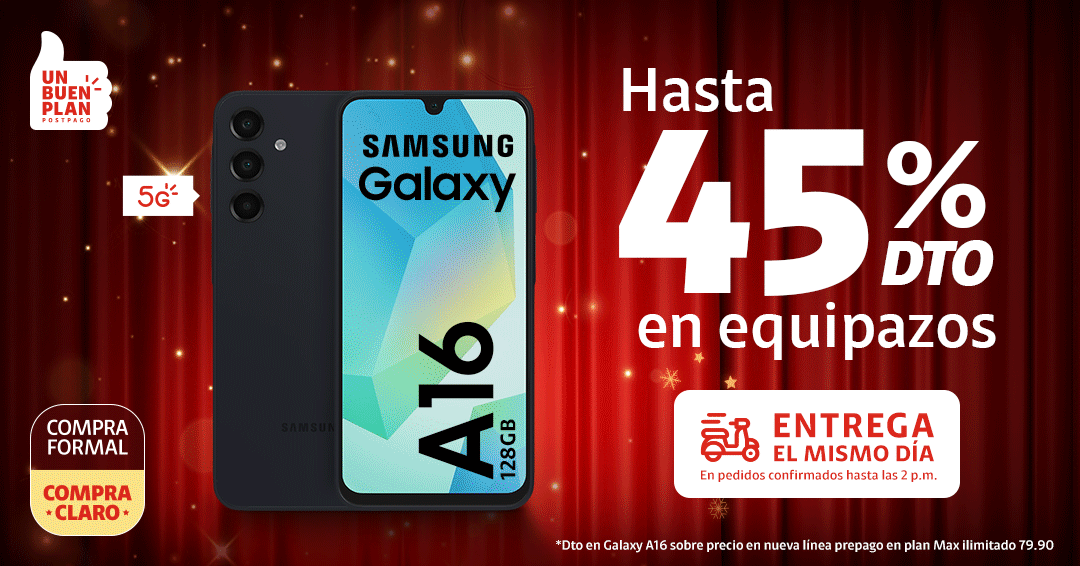 | | | |  | | |  | | ENTREGA EL MISMO DÍA En pedidos confirmados hasta las 2 p.m. | | En pedidos confirmados hasta las 2 p.m. | | |  | | Con tu línea 964433480 | |  | *En Renovación. Cobertura 5G y cómo disfrutarlo en claro.pe/5g Sujeto a evaluación crediticia (clientes DNI y RUC 10). Vale al 30.11.25 y/o hasta agotar stock. Stock mín.: 3. Al contado con acuerdo de equipos a 18 meses. En renovación con acuerdo de equipos concluido. Costo de equipo no incluye costo del plan. Restricciones: tiendaclaro.pe | | | Tranquilidad y ahorro Protege tu nuevo equipo ante lo inesperado | | |  | Protección Móvil Cuídalo ante robo, rotura de pantalla y más. Más información | | |  | ¡Explora la tienda más chévere! Encuentra muchos más equipos de última generación Más información | | | | | |