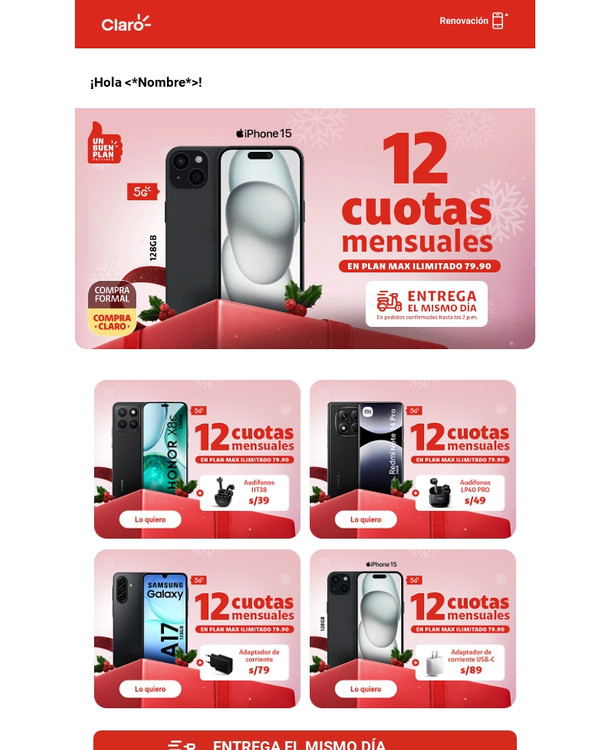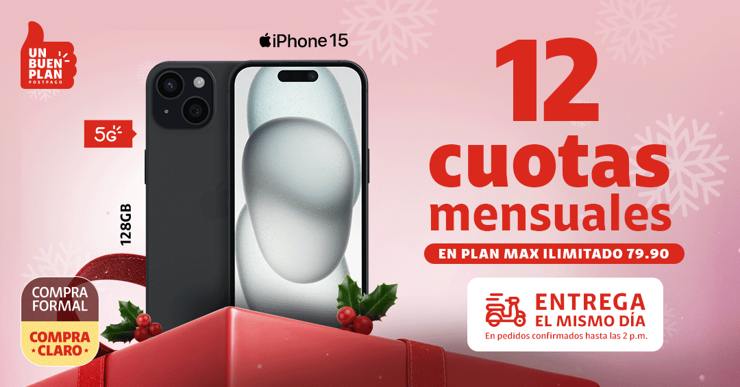 | | | |  | | |  | | ENTREGA EL MISMO DÍA En pedidos confirmados hasta las 2 p.m. | | En pedidos confirmados hasta las 2 p.m. | | |  | | Con tu línea 964433480 | |  | Cobertura 5G y cómo disfrutarla en claro.pe/5g En Renovación. No vale en Cadenas de Tiendas. Sujeto a evaluación crediticia, para clientes DNI o RUC10, hasta el 15.12.25 y/o agotar stock. Stock mín: 3. Acuerdo de equipos y cuotas a 12 meses. En Renovación con acuerdo de equipos concluido de 18 meses. Costo de equipo no incluye costo del plan. Plan Max Ilimitado no vale en Iquitos. Cobertura Delivery Express y más restricciones: tiendaclaro.pe | | | Tranquilidad y ahorro Protege tu nuevo equipo ante lo inesperado | | |  | Protección Móvil Cuídalo ante robo, rotura de pantalla y más. Más información | | |  | ¡Explora la tienda más chévere! Encuentra muchos más equipos de última generación Más información | | | | | |