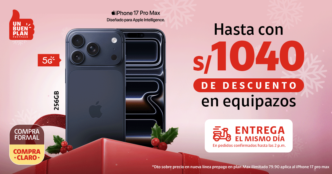 | | | |  | | |  | | ENTREGA EL MISMO DÍA En pedidos confirmados hasta las 2 p.m. | | En pedidos confirmados hasta las 2 p.m. | | |  | | Con tu línea 964433480 | |  | *En Renovación. Cobertura 5G y cómo disfrutarlo en claro.pe/5g Sujeto a evaluación crediticia (clientes DNI y RUC 10). Vale al 15.12.25 y/o hasta agotar stock. Stock mín.: 3. Al contado con acuerdo de equipos a 18 meses. En renovación con acuerdo de equipos concluido. Costo de equipo no incluye costo del plan. Restricciones: tiendaclaro.pe tiendaclaro.pe | | | Tranquilidad y ahorro Protege tu nuevo equipo ante lo inesperado | | |  | Protección Móvil Cuídalo ante robo, rotura de pantalla y más. Más información | | |  | ¡Explora la tienda más chévere! Encuentra muchos más equipos de última generación Más información | | | | | |