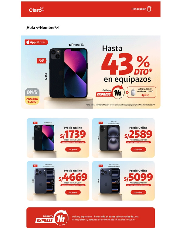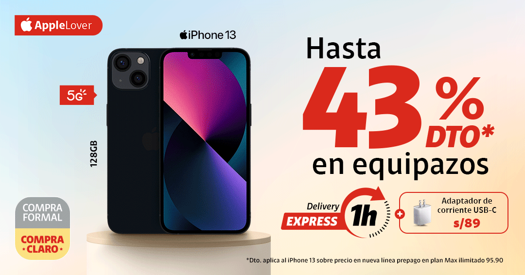 | | | |  | | |  | | Delivery Express en 1 hora valido en zonas seleccionadas de Lima Metropolitana y para pedidos confirmados hasta las 5:00 p.m. | | |  | | Con tu línea 964433480 | |  | *En Renovación. Cobertura 5G y cómo disfrutarlo en claro.pe/5g Sujeto a evaluación crediticia (clientes DNI y RUC 10). Vale al 26.01.26 y/o hasta agotar stock. Stock mín.: 3. Al contado con acuerdo de equipos a 18 meses. En renovación con acuerdo de equipos concluido. Costo de equipo no incluye costo del plan. Restricciones: tiendaclaro.pe | | | ¡Suma Claro puntos! Por pagar a tiempo tu recibo, ya tienes Claro puntos acumulados. | | |  | ¡Canjea Claro puntos por un descuento adicional! Consúltalo con tu asesor y obtén un descuento mayor para tu equipo. Ver Equipos | | | |  | | | Tienda Claro | | Encuentra las mejores marcas en equipos y accesorios. | | | | | | | | | |
