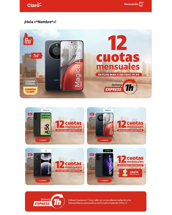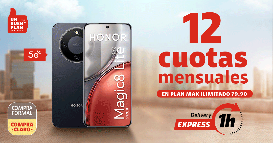 | | | |  | | |  | | Delivery Express en 1 hora valido en zonas seleccionadas de Lima Metropolitana y para pedidos confirmados hasta las 5:00 p.m. | | |  | | Con tu línea 964433480 | |  |  | Cobertura 5G y cómo disfrutarla en claro.pe/5g En Renovación. No vale en Cadenas de Tiendas. Sujeto a evaluación crediticia, para clientes DNI o RUC10, hasta el 31.01.26 y/o agotar stock. Stock mín: 3. Acuerdo de equipos y cuotas a 12 meses. En Renovación con acuerdo de equipos concluido de 18 meses. Costo de equipo no incluye costo del plan. Plan Max Ilimitado no vale en Iquitos. Cobertura Delivery Express y más restricciones: tiendaclaro.pe Recibirás el mensaje de la Ruleta Gandora, solicita recibir publicidad y participa. No aplica para RUC 20. Vale del 01/01/26 al 20/01/26 y/o hasta agotar stock. Stock de premios: 1536033. Max. 1 premio por línea o play Claro Hogar. Premio de celulares no disponible para prepago. También participan clientes actuales que realicen las operaciones de la promoción. Tipos de premios según plan y restricciones: claro.pe/ruletaganadora | | | Tranquilidad y ahorro Protege tu nuevo equipo ante lo inesperado | | |  | Protección Móvil Cuídalo ante robo, rotura de pantalla y más. Más información | | |  | ¡Explora la tienda más chévere! Encuentra muchos más equipos de última generación Más información | | | | | |