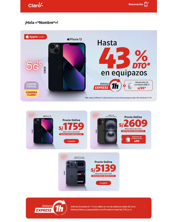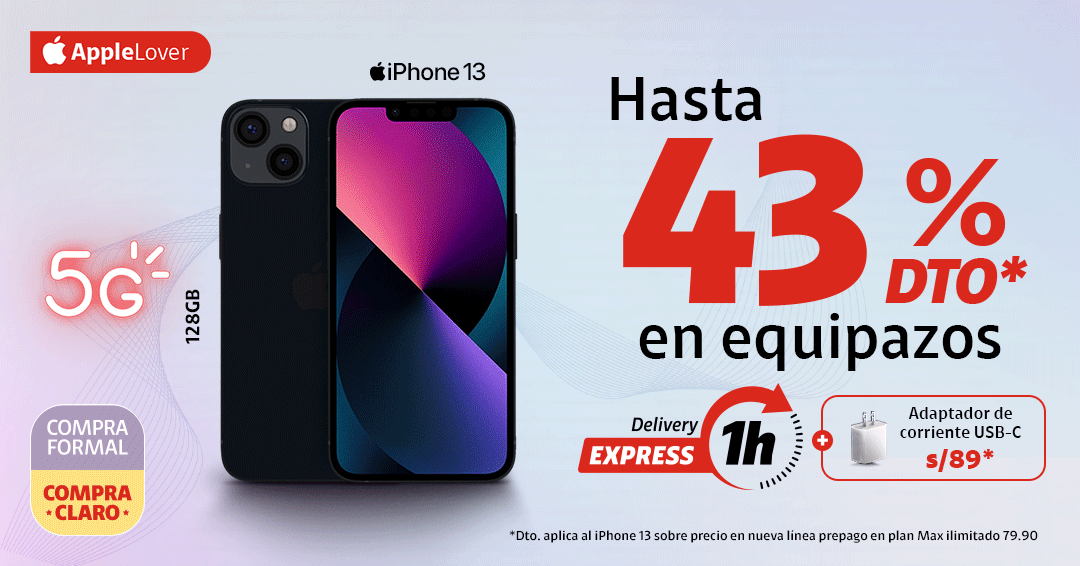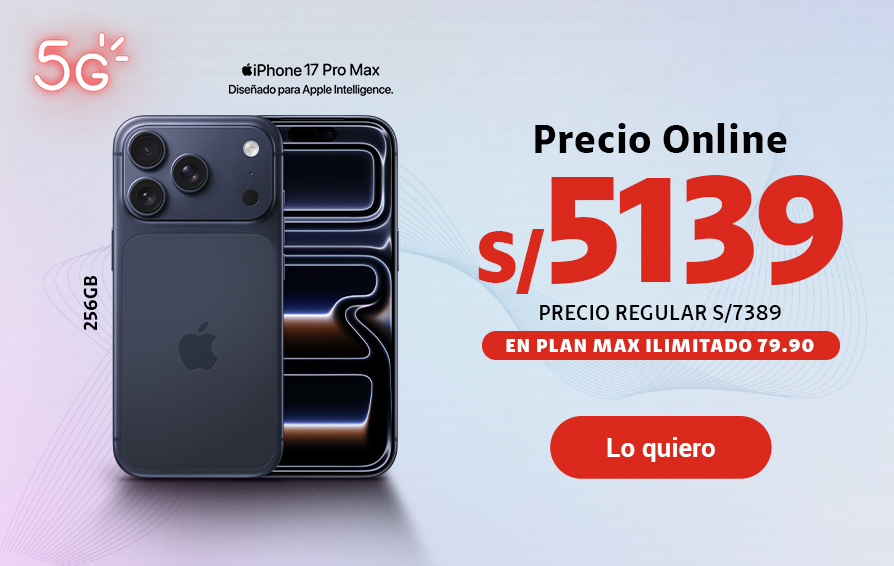 | | | |  | | | | |  | | Delivery Express en 1 hora valido en zonas seleccionadas de Lima Metropolitana y para pedidos confirmados hasta las 5:00 p.m. | | |  | | Con tu línea 964433480 | |  | Cobertura 5G y cómo disfrutarlo en claro.pe/5g Sujeto a evaluación crediticia. Precio de venta de equipo válido en todos los canales al 23.02.26 y/o hasta agotar stock. Al contado con acuerdo de equipos a 18 meses. Stock mín: 10. Máx. 1 equipo por línea. Renovación con acuerdo de equipos vencido. Portabilidad de postpago a postpago. Planes Max Ilimitados no disponibles en Iquitos. Se garantiza 40% de la velocidad contratada. Plan Max Ilimitado 79.90 incluye 125GB al mes en alta velocidad. Consulta condiciones y restricciones en claro.pe . Precio de venta del accesorio sujeto a la compra del equipo iPhone de la promoción, válido solo para CAC, tienda virtual y televentas. | | | ¡Suma Claro puntos! Por pagar a tiempo tu recibo, ya tienes Claro puntos acumulados. | | |  | ¡Canjea Claro puntos por un descuento adicional! Consúltalo con tu asesor y obtén un descuento mayor para tu equipo. Ver Equipos | | | |  | | | Tienda Claro | | Encuentra las mejores marcas en equipos y accesorios. | | | | | | | | | |