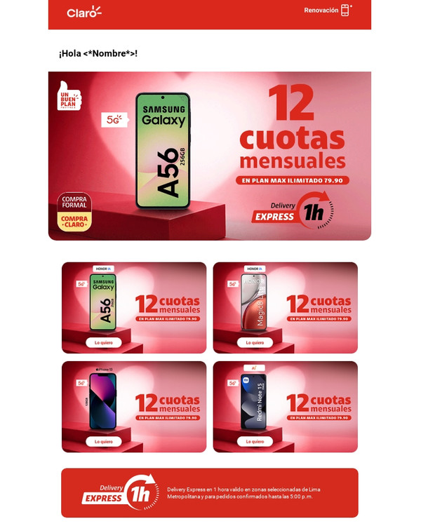 | | | |  | | |  | | Delivery Express en 1 hora valido en zonas seleccionadas de Lima Metropolitana y para pedidos confirmados hasta las 5:00 p.m. | | |  | | Con tu línea 964433480 | |  | Cobertura 5G y cómo disfrutarla en claro.pe/5g En Renovación. No vale en Cadenas de Tiendas. Sujeto a evaluación crediticia, para clientes DNI o RUC10, hasta el 14.02.26 y/o agotar stock. Stock mín: 3. Acuerdo de equipos y cuotas a 12 meses. En Renovación con acuerdo de equipos concluido de 18 meses. Costo de equipo no incluye costo del plan. Plan Max Ilimitado no vale en Iquitos. Cobertura Delivery Express y más restricciones: tiendaclaro.pe | | | Tranquilidad y ahorro Protege tu nuevo equipo ante lo inesperado | | |  | Protección Móvil Cuídalo ante robo, rotura de pantalla y más. Más información | | |  | ¡Explora la tienda más chévere! Encuentra muchos más equipos de última generación Más información | | | | | |
