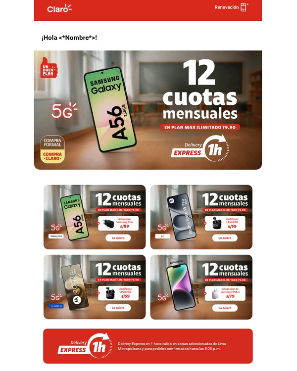 | | | |  | | |  | | Delivery Express en 1 hora valido en zonas seleccionadas de Lima Metropolitana y para pedidos confirmados hasta las 5:00 p.m. | | |  | | Con tu línea 964433480 | |  | Cobertura 5G y cómo disfrutarla en claro.pe/5g En Renovación. No vale en Cadenas de Tiendas. Sujeto a evaluación crediticia, para clientes DNI o RUC10, hasta el 15.03.26 y/o agotar stock. Stock mín: 3. Acuerdo de equipos y cuotas a 12 meses. En Renovación con acuerdo de equipos concluido de 18 meses. Costo de equipo no incluye costo del plan. Plan Max Ilimitado no vale en Iquitos. Cobertura Delivery Express y más restricciones: tiendaclaro.pe | | | Tranquilidad y ahorro Protege tu nuevo equipo ante lo inesperado | | |  | Protección Móvil Cuídalo ante robo, rotura de pantalla y más. Más información | | |  | ¡Explora la tienda más chévere! Encuentra muchos más equipos de última generación Más información | | | | | |